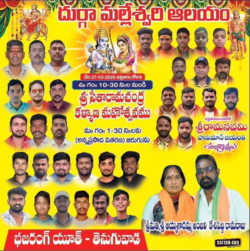 తెలంగాణలోని దుర్గామల్లేశ్వరి ఆలయంలో భజరంగ్ యూత్ ఆధ్వర్యంలో రేపు (మార్చి 27, 2026) శ్రీ సీతారాముల కళ్యాణ మహోత్సవం నిర్వహించనున్నట్లు నిర్వాహకులు తెలిపారు.ఈ కార్యక్రమం ఉదయం 10:30 గంటలకు ప్రారంభం కానుంది.ఈ మహోత్సవానికి సంబంధించి అన్ని ఏర్పాట్లు పూర్తి చేసినట్లు తెలిపారు. భక్తులు పెద్ద సంఖ్యలో హాజరుకావాలని నిర్వాహకులు కోరారు. కార్యక్రమంలో ప్రత్యేక పూజలు, అర్చనలు, అనంతరం అన్నప్రసాదం పంపిణీ చేయనున్నట్లు వివరించారు.ఈ సందర్భంగా ఆలయ పరిసరాల్లో శుభ్రత, భక్తులకు సౌకర్యాలు, ట్రాఫిక్ నియంత్రణ వంటి ఏర్పాట్లు చేపట్టినట్లు నిర్వాహకులు పేర్కొన్నారు. భక్తులు సమయానికి హాజరై శ్రీ సీతారాముల దివ్య ఆశీస్సులు పొందాలని కోరారు.